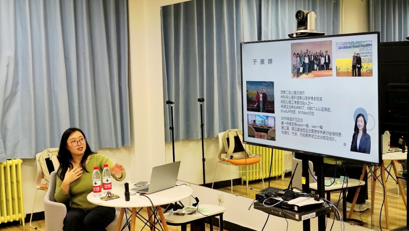 同学们分享了自身睡眠情况及睡眠问题。于淑婷结合现场的情况向大家介绍了什么是正念,通过故事举例让大家了解到主观的想象推测与客观现实之间的差距,并解释了正念与睡眠之间的联系。此后,于淑婷通过引导同学们关注手机与葡萄干的细节,进而让大家意识到日常忙碌中忽略掉的生活中的细节,并为大家做了一次“身体扫描”,引导同学们将注意力关注到身体的每个部位。于淑婷通过讲述两把剑的故事向大家说明了从失眠到因失眠而焦虑不安的连环反应。最后,于淑婷通过模拟推拉实验与失眠对抗的过程来引导大家:面对睡眠问题,最好的办法不是与之对抗,而是转移我们的注意力,顺势而为。