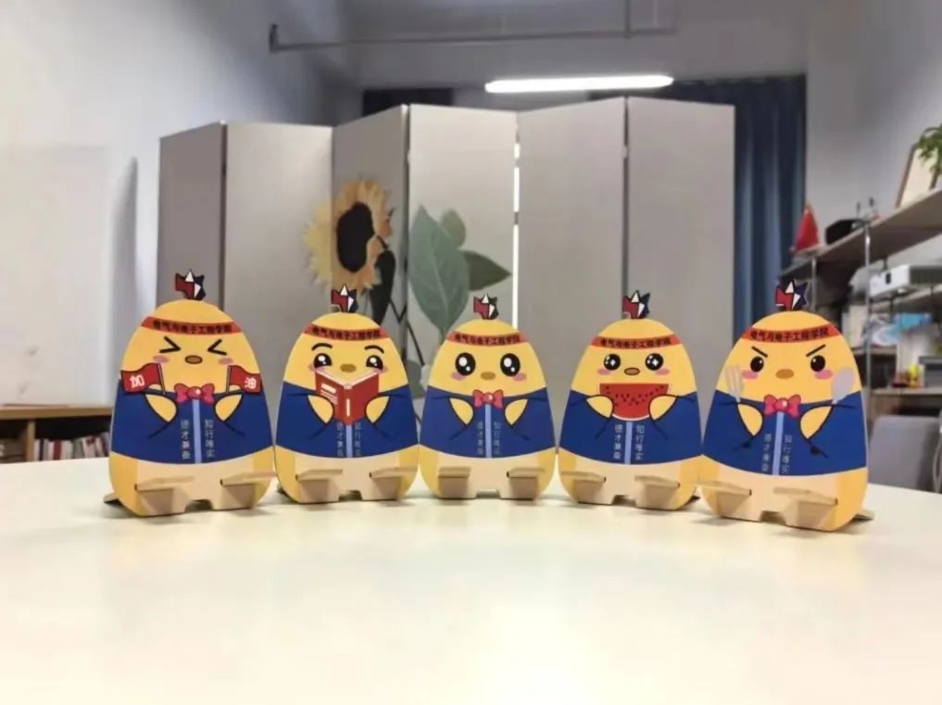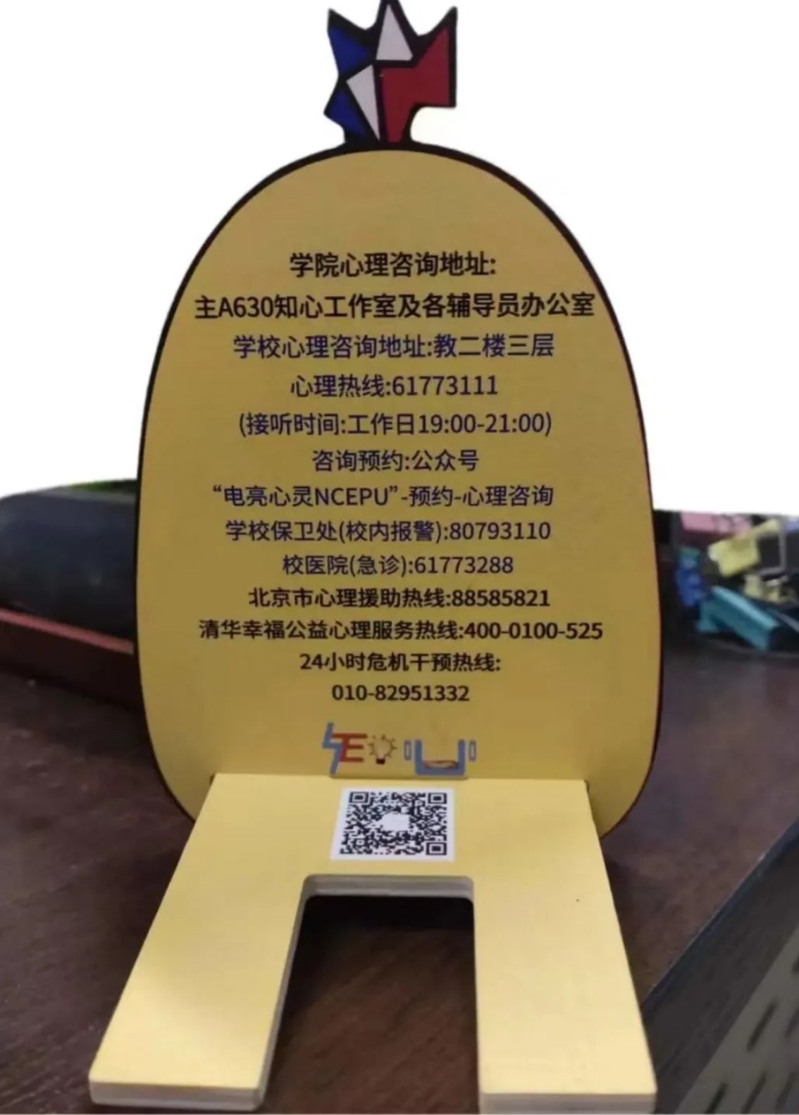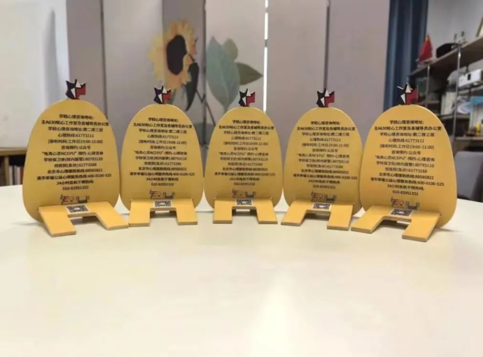 ”“德才兼备、知行唯实”的字样,这不仅是对学院精神的传承,也是对师生们的⼀种鞭策和鼓励。通过这种方式,希望师生们能够时刻铭记学院的教育理念,努力成为堪当民族复兴大任的时代新人。⽀架背面印制有心理咨询室地址方式等详细信息,这是对师生们心理健康的⼀种关怀和提醒。在面对学习、生活压力时,希望⼤家能够及时寻求⼼理帮助,保持⾝心健康。小电鸡手机支架采用木质环保材料制作,既符合环保理念,也体现了学院对可持续发展的追求。我们希望能够引导师生们关注环境保护,共同为可持续发展贡献力量。支架特别定制了“吃瓜鸡”、“读书鸡”、“可爱鸡”、“博学鸡”和“干饭鸡”五种款式,让大家的手机支架充满个性!无论是在图书馆、教室还是宿舍,小电鸡都能为大家提供方便。希望它可以守护大家的健康心态,陪伴大家度过每一个快乐时刻!