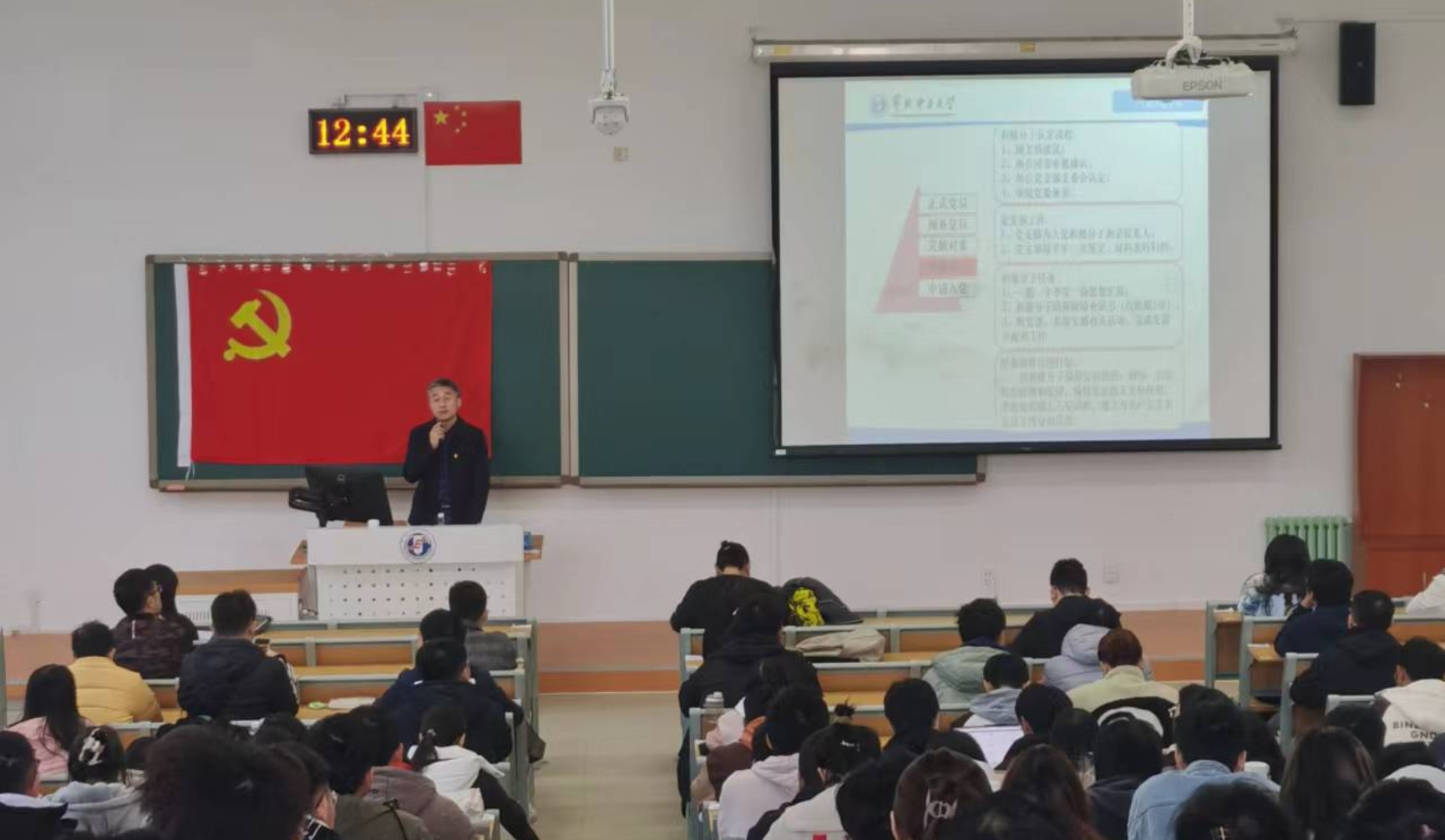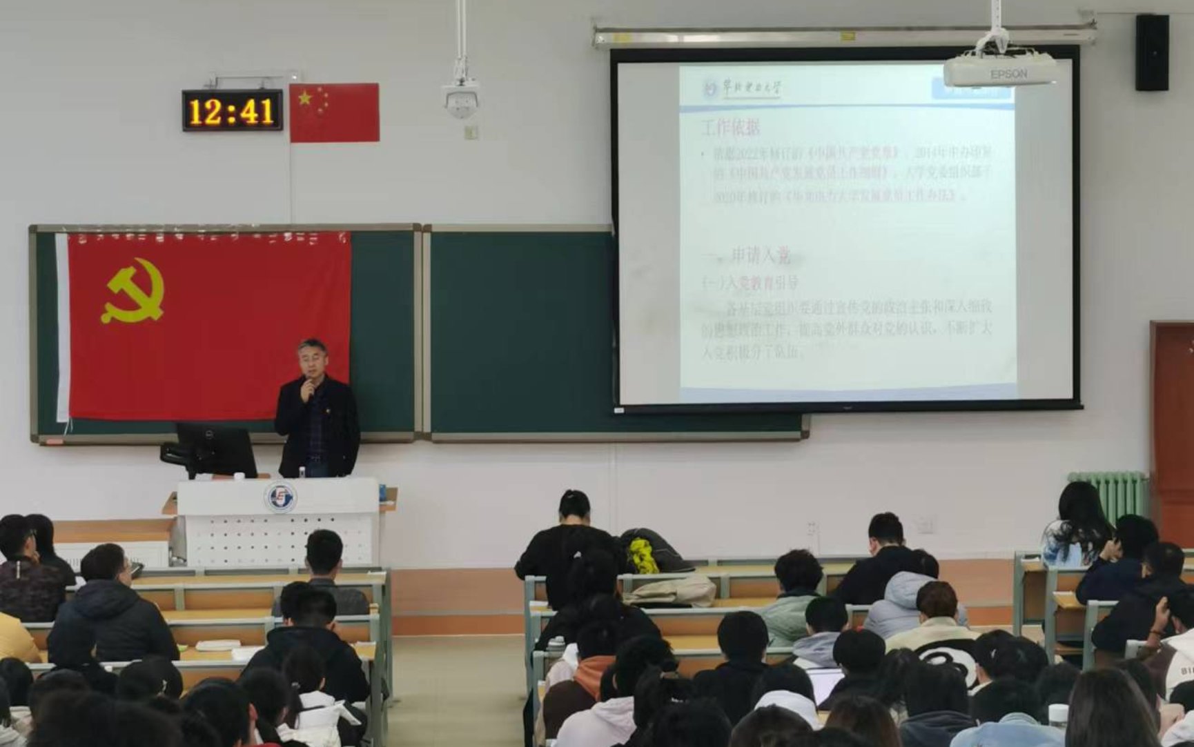 张宝良首先向同学们介绍了学校党员发展工作的依据《中国共产党章程》、《中国共产党发展党员工作细则》和《裸拍