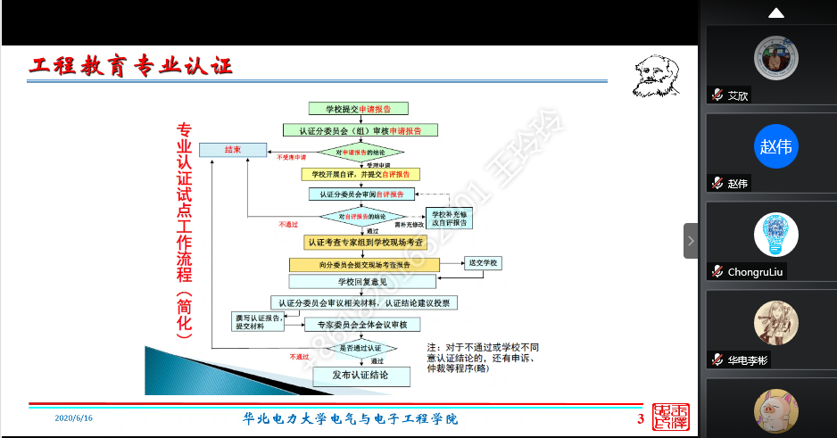 专业认证专家艾欣教授,结合自身三次组织开展我校电气工程及其自动化专业通过认证的成功经验,对通信工程如何做好专业认证进行了指导。艾教授认为大学分为北京、保定两地办学,但是人才培养方案应该是统一的,至少培养方案中的必须课程应该完全一致,选修课程基于学生开展实习实践的条件不同可以具有地方特色。