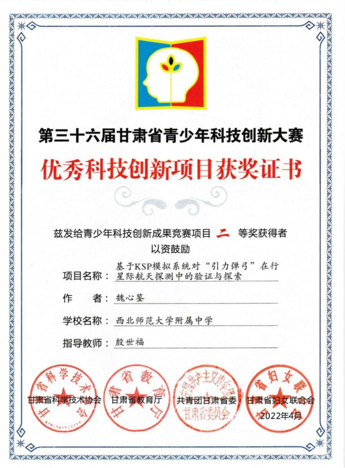中华儿女多奇志,漫步寰宇问苍穹。魏心鉴还有着对航空航天的热爱。他深知一次次长征腾空、嫦娥落月的背后是无数科研人员的孜孜不倦、精益求精。他将这种精神化于学科探究之中,高二时看到第三十六届全国科创比赛的举办消息,他不假思索地报了名。面对科创大赛“创新度、实践度、精深度”的办赛理念,基于对航天的喜爱与相关专业知识,魏心鉴将自己的研究课题定为了《基于KSP模拟系统对“引力弹弓”在行星际航天探测中的验证与探索》。从调阅论文、查阅各国相关资料、设计测试方案、组织模拟测控网,到“引力弹弓”轨道设计、单个航天器的设计布局、发射,再到将笔下的轨道设计还原到模拟系统中、模拟各国有关探测器的变轨过程,魏心鉴全部自行完成,最后呈现出自己的课题报告并完成现场答辩,最终获评为省级二等课题。每当遇到艰深的理论或模拟中不测的意外,他也有过无从下手和迷茫彳亍。他热爱航空航天,不单单欣赏腾飞升空的绚丽和遨游天宫的浪漫,更感动于能让这些庞然大物如燕般翻飞的力量与精神。“从最小的旋翼机到偌大的空间站,工程师们能够将它们从图纸变为现实,从零件变为整体,从实验室走向空天,背后一丝不苟、尽善尽美的精神,不应该是每一个华电人应有的品质吗?”魏心鉴说出了他热衷科技创新的原因。他以华电甘肃省第一名的成绩进入裸拍