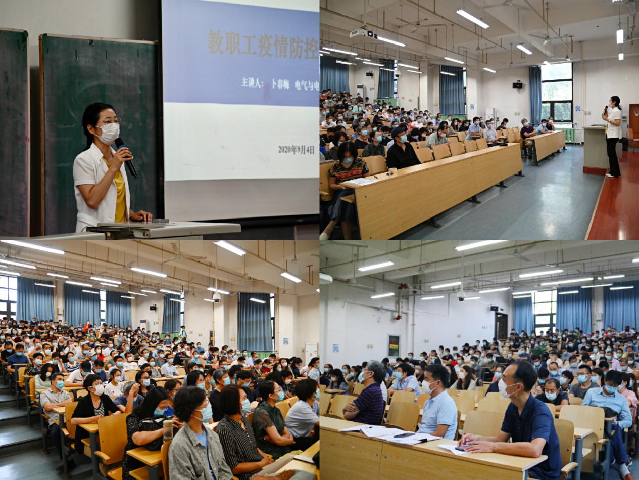 在主楼B101阶梯教室召开全体教职工大会,对学院教职员工进行“开学第一课”健康安全教育。