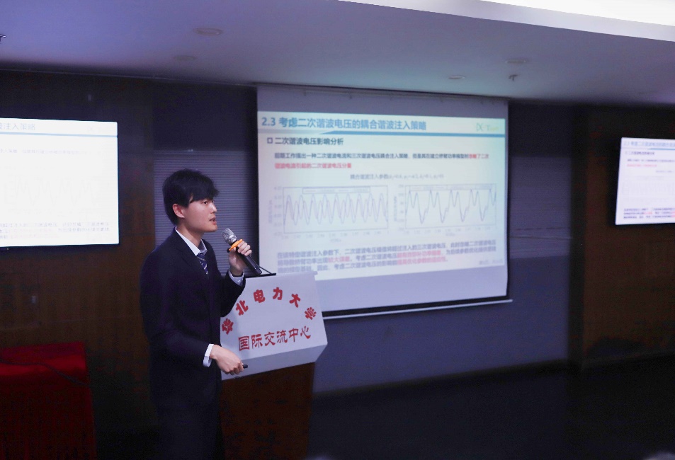 师从许建中副教授的硕士研究生邓伟成带来了接下的报告——“适用于MMC轻型化的谐波注入策略研究”,邓伟成硕士从研究背景及意义、稳态谐波注入方法、暂态谐波注入方法和结论与展望四个方面进行了详细的介绍。最后他和大家分享了自己在科研工作中的一些心得体会,对在座的各位研究生特别是研一的同学们有很好的启发作用。