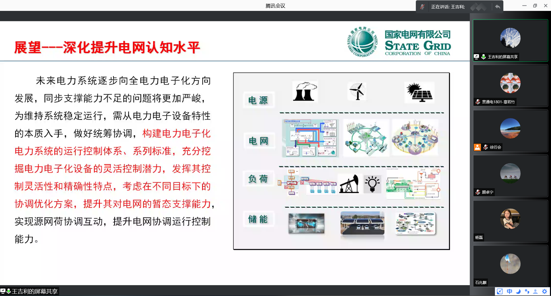 最后,王处长进行了总结和展望。新能源暂态性能对电网稳定具有显著影响,开展新能源控制策略优化对于提升高占比新能源电网的安全稳定运行水平具有重要意义。同时,我们需要进一步深化高比例新能源电网的认知水平,深入分析电网的稳定机理,提升高比例电力电子化电网建模的准确度,为新能源控制优化目标和方案的确定提供更加可靠的依据。
