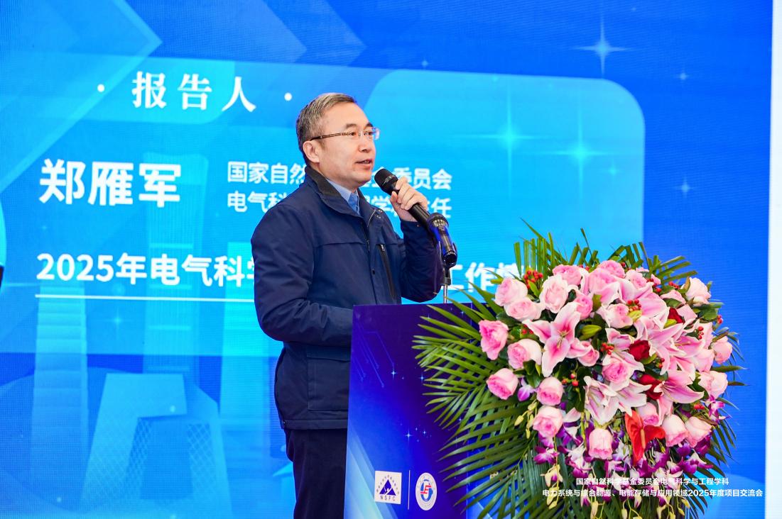 郑雁军主任作大会主旨报告,报告中重点介绍了2025年度电工学科项目申请和资助情况,展示了电工学科在2025年实现若干重大人才类项目的突破,宣读了2025年电力系统与综合能源、电能存储与应用领域评优结果,并预祝本次交流会取得圆满成功。