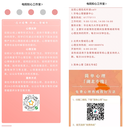 为将网络心理辅导覆盖到每一位学生,知心工作室发布多篇“心理处方”,普及心理健康知识,引导学生加强心理防护,在疫情面前注意增强自身情绪状态的觉察,多与家人进行沟通互助,及时调节消极情绪。积极动员心理委员参与线上心理服务培训课,积极发挥“同伴教育”和“朋辈辅导”的辐射作用,使他们看待心理服务工作的思维和视野得到拓展,树立主动服务意识,积极作为,更好的帮助周边同学。